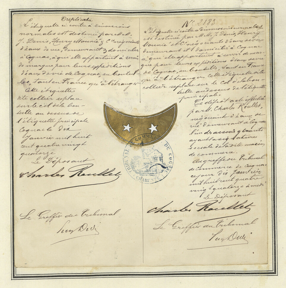 - Étiquette centrale ovale, dorée, deux étoiles, texte en lettres d'or.