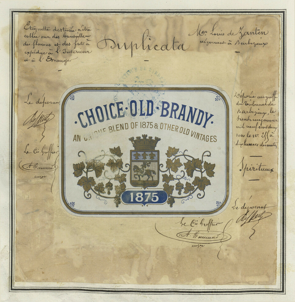 - Étiquette centrale bleue et dorée, motif de vigne, année 1875.