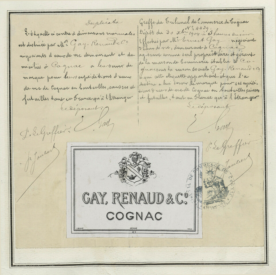 - Rectangle central, texte foncé sur fond clair, armoiries, marqué 'Cognac'.