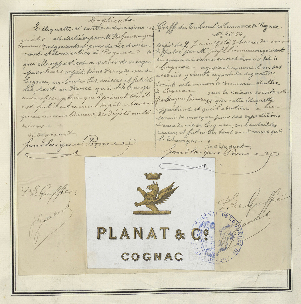 - Rectangle blanc, texte noir, symbole doré central, couronne, griffon, inscription Cognac.