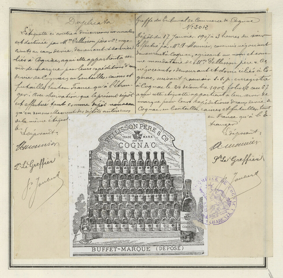 - Étiquette avec illustration de bouteilles de cognac et verre, en noir et blanc.