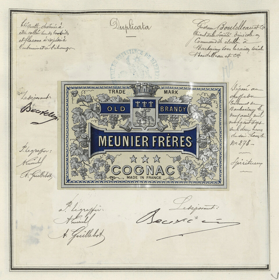 - Étiquette centrale ornée, bleue, avec des motifs floraux et le mot 'Cognac'.