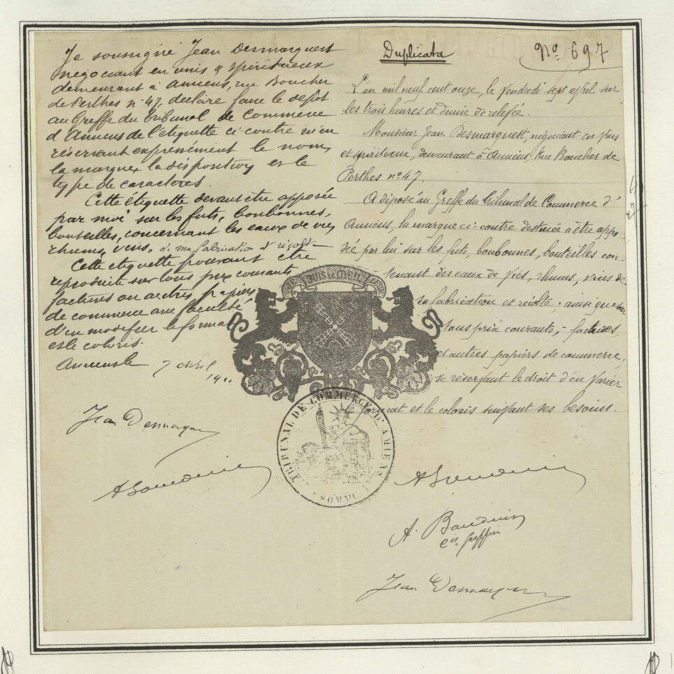 - Rectangle central, noir et blanc, texte écrit à la main, tampons ronds, coat of arms.