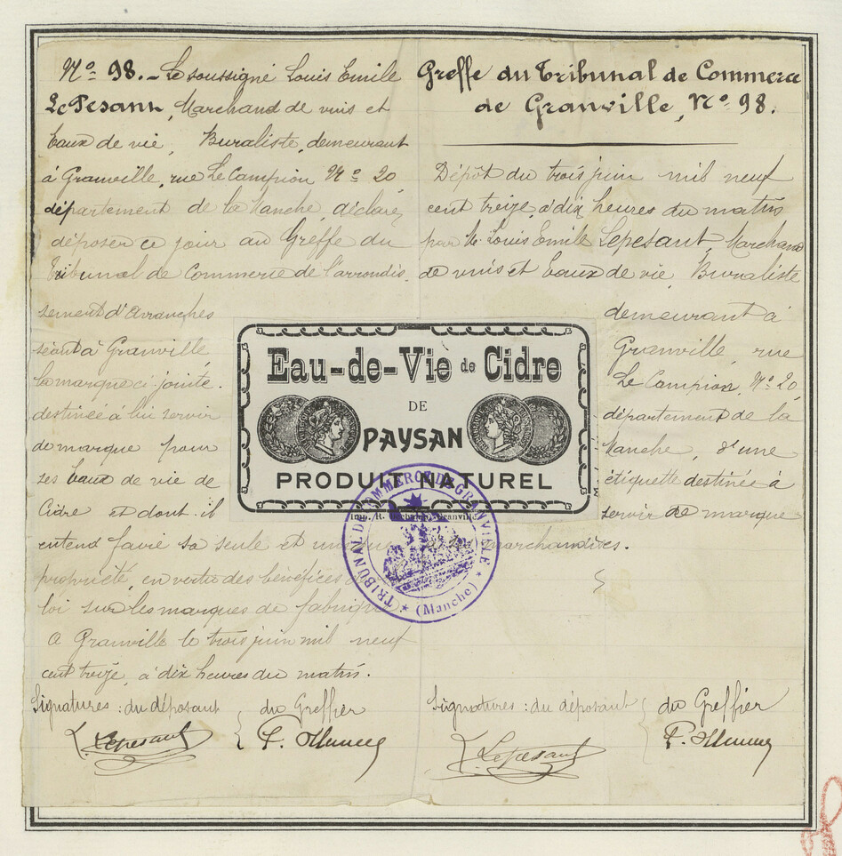- Étiquette centrale blanche et noire, avec des portraits et un tampon violet.