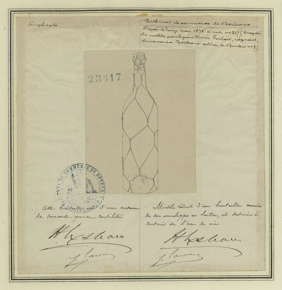 - Rectangle central, texte en bleu, motif de bouteille, tampon bleu en bas