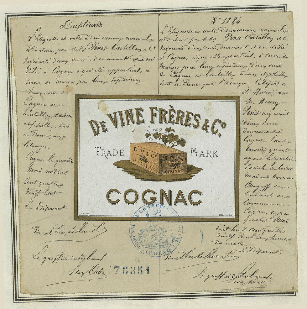 - Étiquette rectangulaire, couleurs beige et doré, illustration d'une boîte de cognac.